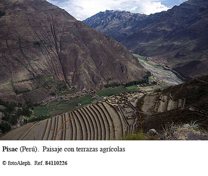 como Tipón o Moray.Tipón Desde la misma cuenca del río Huatanay, cerca del pueblo de Oropesa, a unos 30 km del Cuzco, una empinada subida conduce a un vallejo que está totalmente urbanizado con escalonamientos de terrazas de labranza. Es el yacimiento arqueológico inca de Tipón, que poco tiene de ruinas, pues la mayoría de las construcciones agrícolas del sitio se mantienen en un excelente estado de conservación, y el sistema de regadío que idearon los incas sigue en funcionamiento. Amplios bancales de piedra de sillería poligonal se encaraman por los laterales y el fondo del valle formando en conjunto un grandioso anfiteatro de planta rectangular, cuya base se descuelga también escalonadamente por la ladera del monte (foto151). Una red de canaletas encastradas en los suelos y paredes de piedra del graderío se ramifica por los andenes o bancales aterrazados y, bajando ordenadamente de escalón en escalón, suministra agua a las sucesivas huertas. El agua proviene de manantiales subterráneos, y al poco de la surgencia atraviesa una elaborada fuente de piedra con caños y cisternas dispuestos de tal forma que hacen que la corriente de agua se divida primero en dos chorros y luego en cuatro chorros, para terminar por unificarse en una alberca de la que nacen nuevos canales (foto154). Se trata probablemente de una fuente ceremonial donde tendría lugar algún rito de culto al Agua, práctica inseparable de las labores físicas de labranza. Indice de textos Moray No lejos del Valle Sagrado de los Incas, a una veintena de kilómetros al sudeste de Ollantaytambo, existe en lo alto de una meseta un curioso yacimiento arqueológico que da fe de lo asombrosamente avanzadas que estaban las técnicas agrícolas entre los pueblos andinos prehispánicos. Estamos en Moray, un paisaje cultural sin equivalente en ningún lugar del mundo (foto066). Tres enormes cráteres perfectamente circulares se abren en el suelo y sus paredes internas descienden en escalones hacia lo hondo, creando unos espacios que se asemejan a gigantescas plazas de toros construidas en piedra (foto067). En este caso los habituales andenes agrícolas aterrazados de las ciudades incas no son rectangulares, sino que forman círculos concéntricos que se van adentrando en la tierra. Una sucesión de peldaños