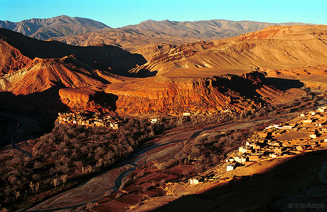 23.  Valle del Mgun. Panorama con dos pueblos de adobe, en el Alto Atlas