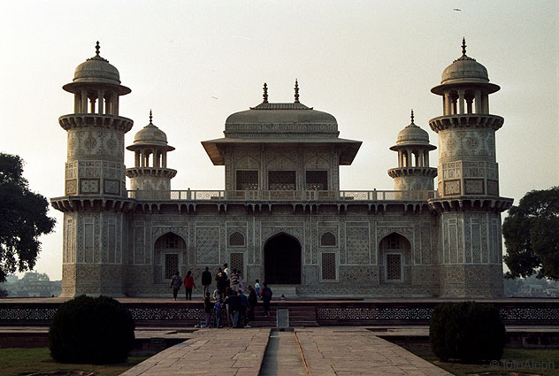 La tumba del suegro de Jahangir y abuelo de Mumtaz Mahal es relativamente pequeña, pero de armoniosas proporciones y exquisita decoración, consistente en un revestimiento integral de mármoles de colores que cubre la totalidad de sus muros y fachadas.