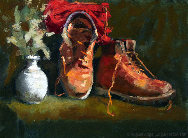 Miguel Angel Eugui nos revela en esta exposición de bodegones una de las facetas por las que discurre su pintura, en la que deja demostrado que un bodegón puede ser todo excepto una 'naturaleza muerta'. Que basta una mirada alrededor para descubrir un universo de motivos pictóricos agazapado en la cotidianidad que nos envuelve. Un cosmos de objetos insignificantes pero llenos de fuerza visual, que suelen entablar con el pintor callados coloquios y le cuentan secretas historias.