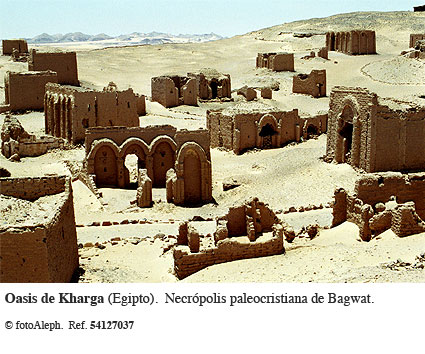 A 30 km al sur de la ciudad de Kharga, en Qasr ez-Zayan, un lugar que en la antigüedad se conocía como Tchonemyris, resisten sobre una colina las ruinas de un templo consagrado a Amenebis (Amón de Hibis). Su pórtico fue reconstruido durante el tercer año de reinado del emperador romano Antonino Pío, como puede leerse en una inscripción griega grabada sobre la puerta de entrada al patio. Al igual que el de Qasr el-Ghueita, este santuario está englobado dentro de un complejo de dependencias de adobe crudo, que le confieren visto de lejos el aspecto de una fortaleza (foto35). De ahí el nombre de Qsar (= alcázar), con que se les designa actualmente en la toponimia local. Desperdigados por el oasis del Kharga se pueden encontrar numerosos aunque muy deteriorados restos arquitectónicos de la época de la dominación romana de Egipto, como por ejemplo el templo-fortaleza de Nadura, erigido cerca de la capital bajo el reinado de Adriano y Antonino Pío, o el fuerte romano de Ed-Deir, a unos 30 km de la capital, instalado en pleno desierto para controlar la ruta de caravanas que pasaba por allí hacia el valle del Nilo. A 85 km al sur, en los límites meridionales del oasis, está Tell Dush, la antigua Cysis, que desempeñó un papel importante como plaza fuerte fronteriza en la encrucijada de vías que conectaban Sudán con Egipto, y donde se pueden apreciar aún las ruinas de un templo consagrado a Isis y Osiris de la época de Domiciano y Adriano. Hay también unos escasos restos de una ciudad romana muy arruinada entre el templo de Nadura y la necrópolis cristiana de Bagwat. Indice de textos Necrópolis paleocristiana de Bagwat El ingente patrimonio arqueológico de la época faraónica que atesora el valle del Nilo ha relegado a un segundo término las manifestaciones artísticas de la época paleocristiana, de las que quedan numerosos vestigios en todo Egipto. Tal ocurre por ejemplo con la ciudad de Abu Mena, en el Delta, que, pese a haber sido declarada Patrimonio de la