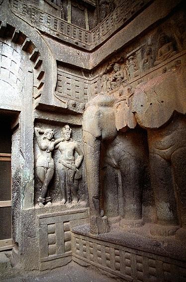 110. Karla (Maharshtra, India). Esculturas en el vestíbulo del chaitya