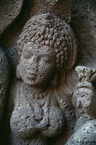 140. Ajanta (Maharshtra, India). Chaitya 19. Detalle de grupo de naga y nagini