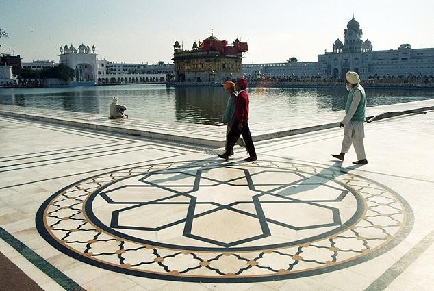 El estanque sagrado se halla en un patio rectangular, pavimentado de losas de mármoles de colores que dibujan al ensamblarse tracerías geométricas, rodeado por sus cuatro lados de naves porticadas de finas columnas de ornamentaciones florales y pabellones con cúpulas blancas y doradas.