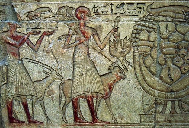 Relieves policromados con sacerdotes portando ofrendas de animales al difunto, en la tumba que se hizo construir el general Horemheb en Saqqara, antes de llegar a ser faraón. Se detecta el estilo llamado 'amárnico', propio del reinado de su antecesor Ajenatón.