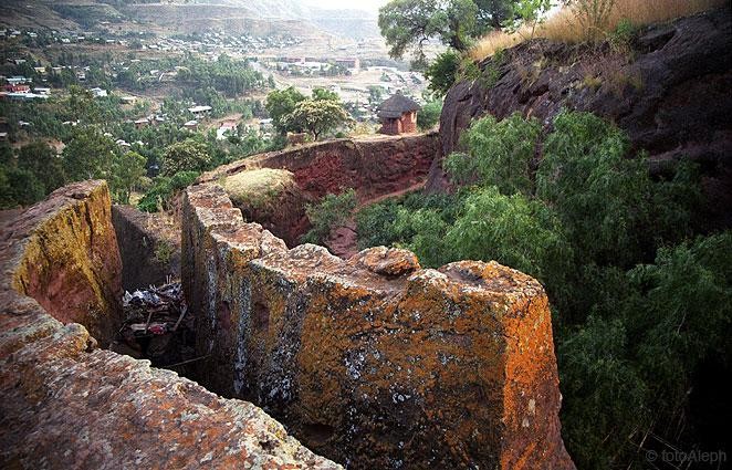 Las iglesias etíopes están siempre circundadas, junto a sus capillas auxiliares, bibliotecas y demás dependencias anexas, por una muralla de piedra que encierra el recinto sacro en su conjunto. En el caso de Lalibela, las murallas son rupestres, esculpidas en la roca madre.