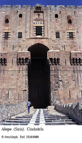 Siria y la segunda del país en número de habitantes. Localizada en el cruce de varias rutas caravaneras que transitaban por Oriente Próximo desde el segundo milenio a C, Alepo fue sucesivamente gobernada por los hititas, asirios, aqueménidas, romanos, bizantinos, árabes, mongoles, mamelucos y otomanos. Alepo disputa con Damasco el rango de ser la ciudad más antigua del mundo habitada de continuo. Su gran mezquita del siglo XII, su imponente ciudadela del siglo XIII, y sus múltiples palacios, madrasas, caravasares y hammams de los siglos XVI y XVII forman parte de la ciudad antigua (rodeada de una larga muralla perforada por tres puertas), hoy amenazada por la superpoblación y la deficiente planificación urbanística, pese a haber sido declarada Patrimonio Mundial por la Unesco en 1986. Mezquita Mayor La construcción de la mezquita aljama o mezquita mayor de Alepo fue iniciada hacia 715 en los terrenos de un cementerio cristiano de época anterior. En origen, su distribución y dimensiones eran semejantes a las de la Gran Mezquita Omeya de Damasco, con cuyos mosaicos rivalizaba. Sin embargo, habiendo sufrido esta mezquita sucesivas destrucciones, nada queda hoy de la original. El edificio actual data de 1158, cuando, tras un incendio, fue reconstruido por el sultán Nur al-Din. Una nueva reconstrucción parcial fue llevada a cabo tras la invasión de los mongoles en 1260. El elemento más antiguo que subsiste en la mezquita es el esbelto minarete (foto03) de planta cuadrada y más de 50 m de alto: data de 1090 y corresponde al periodo selyúcida. Está formado por cinco niveles decorados con arcos polilobulados. En la parte superior, una cornisa sobre muqarnas sostiene la galería desde la que el almuédano llamaba a la oración. El patio, rodeado de arcadas y pavimentado con mármoles de colores, contiene diversos quioscos y una fuente de abluciones. La sala de oración se compone de tres naves transversales con bóvedas de crucería. La Mezquita Mayor de Alepo es célebre por custodiar los restos del profeta Zacarías. Indice de textos Ciudadela La grandiosa Ciudadela de Alepo, que domina desde lo alto de una colina la zona de los zocos, es un imponente testimonio del poderío militar árabe entre los siglos XII y XIV, si bien en su recinto se han hallado vestigios arqueológicos que remontan las fechas de ocupación del lugar al siglo X a C. La fortaleza alberga en el interior de sus murallas restos de un palacio residencial de los gobernadores provinciales, un salón del trono con nueve cúpulas, mezquitas y casas de baños. Quedan también huellas del trazado urbanístico grecorromano de las calles, y ruinas de construcciones paleocristianas del siglo VI d C. La Ciudadela está rodeada de un ancho y profundo foso en todo su perímetro, que se salva por un puente de acceso a la entrada principal construido sobre arcos (foto01). El portalón, abierto en un gran torreón prismático, es abovedado y está dotado de múltiples sistemas defensivos (foto02). La entrada forma un recodo para dificultar los ataques. Los muros están perforados de saeteras. Las ventanas están ornadas con labores de ablaq: juegos de alternancia entre losas de mármol claras y oscuras, una técnica decorativa de la que podemos ver numerosos ejemplos en los monumentos mamelucos y otomanos de El Cairo. Indice de textos Un hammam Al pie de la ciudadela se levanta la casa de baños públicos más lujosa de Alepo: el hammam Yalbougha al-Nasri, del siglo XVI. El exterior del edificio está revestido de mármoles blancos y negros, resaltando una gran cúpula lisa pintada de rosa. Desde la calle, a través de unas escaleras descendentes se llega al vestuario, espacio cuadrado con celdas en cada lado, cubierto con la gran cúpula. El espacio es de gran amplitud en superficie y altura. En todo su perímetro se eleva una plataforma como a 1,50 m, revestida su superficie de alfombras lujosas, y amueblada con bancadas llenas de cojines, todo ello asimismo recubierto de diversas telas de color dominante rojo. Esta superficie elevada está destinada al cambio de ropa (se puede acceder a una especie de alcobas donde hay armarios roperos) y al relax post-baño. Las salas de baño propiamente dichas son varias en sucesión, a temperaturas diferentes, espaciosas, y con cámaras en sus esquinas y laterales, que tienen como misión ofrecer un espacio más discreto. El hammam dispone también de sauna. La iluminación (de noche) está solucionada a base de apliques, y un gran lamparón central que pende de la bóveda del vestuario sobre la piscina o alberca ornamental del centro de la sala. Los suelos y paredes están, hasta una altura de 2 m, revestidos de mármol, el resto está lucido. |