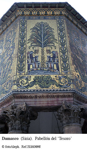 Alepo. La capital de Siria está emplazada al sur del país, en un oasis al pie del monte Jabal Qasiyun, no muy lejos del Mediterráneo, a orillas del inmenso secarral del desierto sirio, que ocupa la mayor parte del país. Desde tiempos inmemoriales, Damasco ha sido un centro comercial y una etapa caravanera en las rutas de los mercaderes de Oriente Próximo. Fue la capital del primer reino semita, citado en los textos egipcios de la XVIII Dinastía. Aliada por algún tiempo al reino de Israel, fue luego gobernada por los sucesores de Alejandro, los nabateos, los romanos y los bizantinos. Los árabes de la dinastía Omeya hicieron de ella su capital, de 661 a 750 d C. Con la expansión de los omeyas se convirtió en una urbe próspera, capital de todo un imperio. Hoy la legendaria Damasco es una ciudad superpoblada (más de 6 millones de habitantes en 2007), industrializada y ruidosa, con barriadas y arrabales que trepan desordenadamente por las faldas de la montaña, en un caos urbanístico de difícil solución. Los restos de su pasado esplendor se concentran en el casco antiguo, declarado Patrimonio de la Humanidad por la Unesco en 1979, pero con claros síntomas de estar en trance de desaparición. Además de los monumentos y viviendas tradicionales de madera de carácter islámico (o judío), se detectan en sus calles numerosos vestigios de la época romana y bizantina, como el templo de Júpiter (foto37) y las murallas con puertas monumentales. Topónimos como la "Via Recta" dan pistas sobre el trazado clásico de tipo ortogonal en que se estructuraban sus calles. Las primeras etapas del cristianismo tuvieron aquí uno de sus escenarios, y aún subsiste hoy un populoso barrio cristiano conviviendo con los musulmanes. Existe una casa de San Ananías y una puerta de Santo Tomás. Hubo una catedral, hoy sustituida por la Gran Mezquita Omeya, que supuestamente custodia la cabeza de San Juan Bautista y tiene un minarete llamado "de Jesús". Indice de textos Gran Mezquita Omeya La mezquita aljama de Damasco yergue su inmensa mole en el corazón de la parte vieja. Si Damasco es, como se dice, la más antigua ciudad del mundo, la mezquita omeya ocupa el emplazamiento más antiguo dentro de esta urbe. Según las excavaciones, en este exacto lugar hubo un templo de Hadad, y luego el inmenso santuario romano de Júpiter, cuyo recinto albergó después, juntas, la catedral de San Juan Bautista y la primera mezquita de Damasco, y hoy día contiene grandes porciones de la vieja urbanización intramuros. La mezquita es más antigua que la de Córdoba, de hecho una de las más antiguas del islam, pero ha experimentado muchas restauraciones. Tiene un patio rectangular muy amplio (foto27) con mosaicos y mármoles de colores, donde está el templete del 'tesoro' levantado sobre columnas y frisos expoliados del templo de Júpiter (foto25). Atravesamos las ruinas del pórtico columnado del templo de Júpiter y el muro de colosales sillares romanos que cerca la mezquita, para salir al patio. Extensos mosaicos cubren el techo del vestíbulo, el intradós de los arcos y varias paredes (foto29). Muestran sin excepción motivos arquitectónicos fantasiosos, en medio de gigantescos árboles y un variado despliegue de ornamentos florales, siempre todo ello sobre un fondo de oro (foto32). Dicen que se trata de una representación del paraíso musulmán. Pero ni una sola figura humana, ni el más pequeño animal, pez o ave se mueve por esas frondas. Toda la decoración es anicónica, pese a que la arquitectura es de aire muy bizantino. Esta combinación de arquitectura y vegetación se repite, dos siglos más tarde, en las pinturas murales –lejanas y únicas– de la iglesia de San Julián de los Prados o Santullano, en Oviedo, y podría tener como precedente motivos parecidos de los mosaicos de la cúpula del Baptisterio de los Ortodoxos, en Ravena; o también, si queremos remontarnos más en el tiempo, en las pinturas murales pompeyanas, aquéllas que muestran imágenes frontales y en falsa perspectiva de palacios o proscenios de teatros, enmarcados en una flora siempre lujuriante. La sala de oración es de planta basilical de tres naves inmensas, con crucero y techo de madera policromada donde sobresale la cúpula "del Águila". Los mihrabs son de taracea de mármol y nácar, de muy minuciosa ejecución. La mayoría de las columnas de la mezquita son corintias reaprovechadas (foto30), y recientes obras han despejado nuevos restos romanos (una columnata en el muro norte). Casi en el centro de la sala de oración se eleva un catafalco de celosías plateadas, sustituto de otro de madera que se quemó en el último incendio sufrido por esta mezquita de accidentada historia; éste alberga un sarcófago que a su vez contiene (¡hela dónde estaba!) la cabeza de san Juan Bautista, la misma, es de suponer, que presentó en bandeja Salomé a Herodes, reliquia que podría ser el único vestigio de la catedral cristiana que hubo justo aquí, venerada hoy –pues también es profeta para los musulmanes– en medio de uno de los más prestigiosos lugares sagrados del islam. Otra reminiscencia cristiana de esta inagotable mezquita: el minarete de Jesús. Se llama así, porque en lo alto de él se aparecerá el Día del Juicio el Mesías, para anunciar a los hombres la llegada del fin del mundo. Indice de textos Caravasar de Selim Este han o caravasar fue construido en 1516 por el sultán Selim para alojar peregrinos pobres (foto38). Hoy es un conjunto de talleres artesanos (entre ellos, de soplado de vidrio) y tiendas, que ocupan las dependencias en torno a un patio porticado con bóvedas sobre arcos apuntados bicolores con dovelas blancas y grises alternadas. En uno de los lados se levanta la sala de oración, coronada de cúpula, con una soberbia puerta de mármoles verdes, blancos y rojos combinados con cerámicas (foto40). Tekkiye Suleymaniye Así es llamada una mezquita-madrasa construida en 1554 por el célebre S